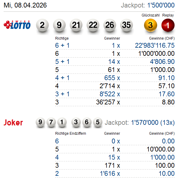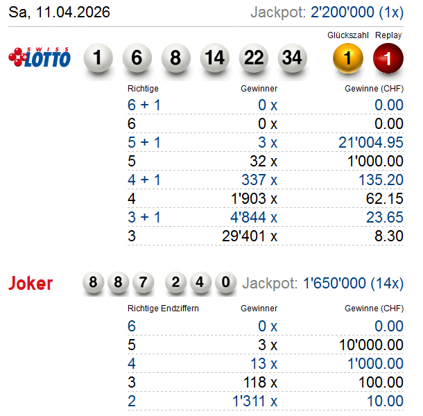 Hier finden Sie aktuelle Swiss Lotto- und Joker Gewinnquoten für die letzten 10 Ziehungen (alle Gewinnränge). Alle Angaben erfolgen ohne Gewähr!