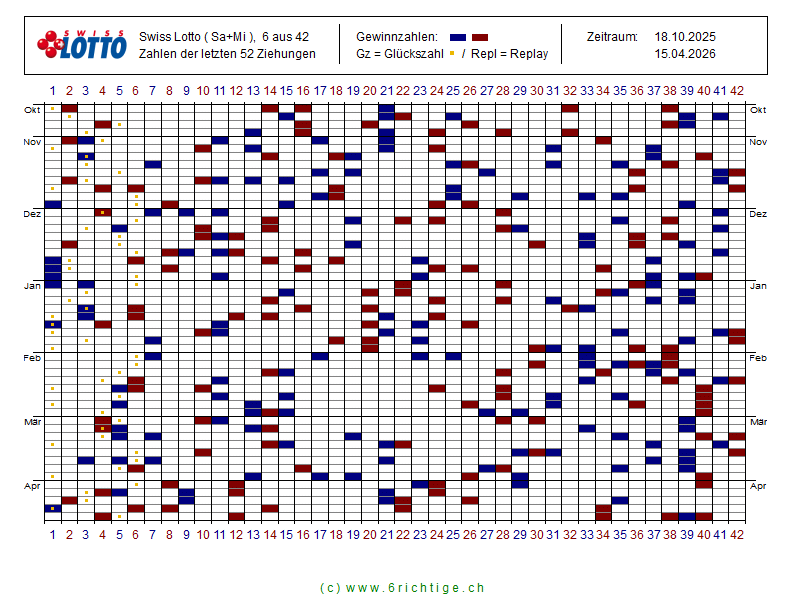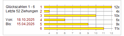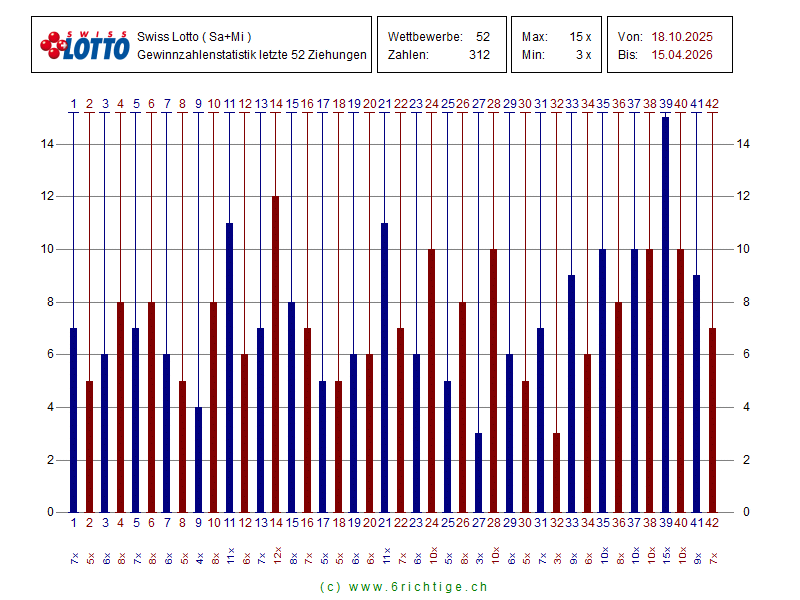 der letzten 52 Ziehungen (6 Monate) bei Swiss Lotto