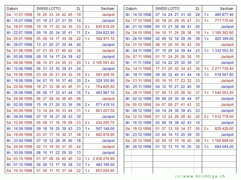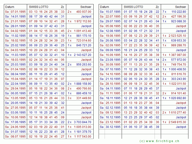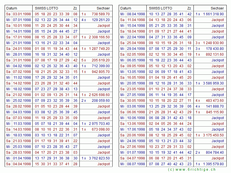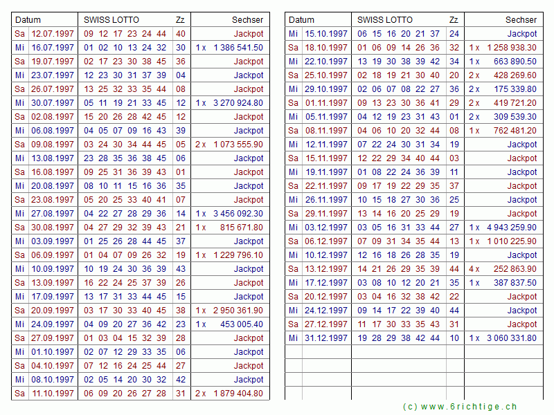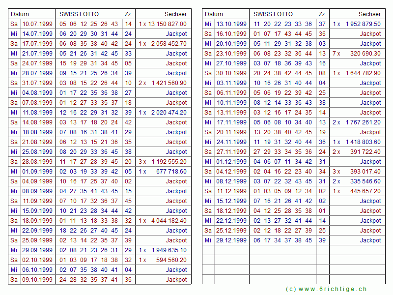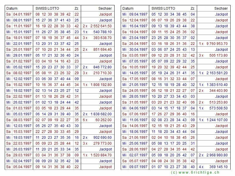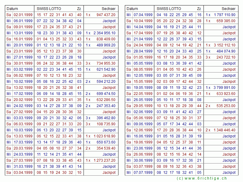 Zahlen- und Quotenarchiv Swiss Lotto und Joker 1970 bis heute
