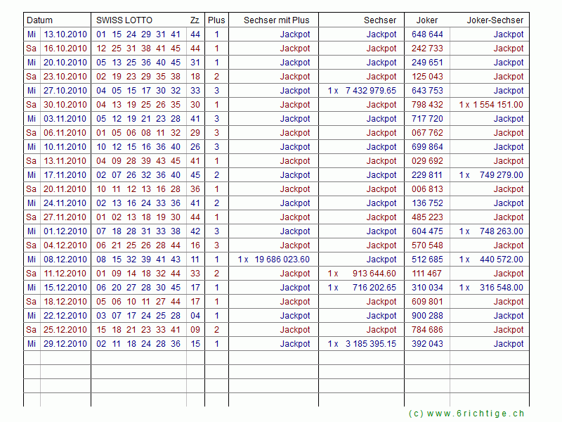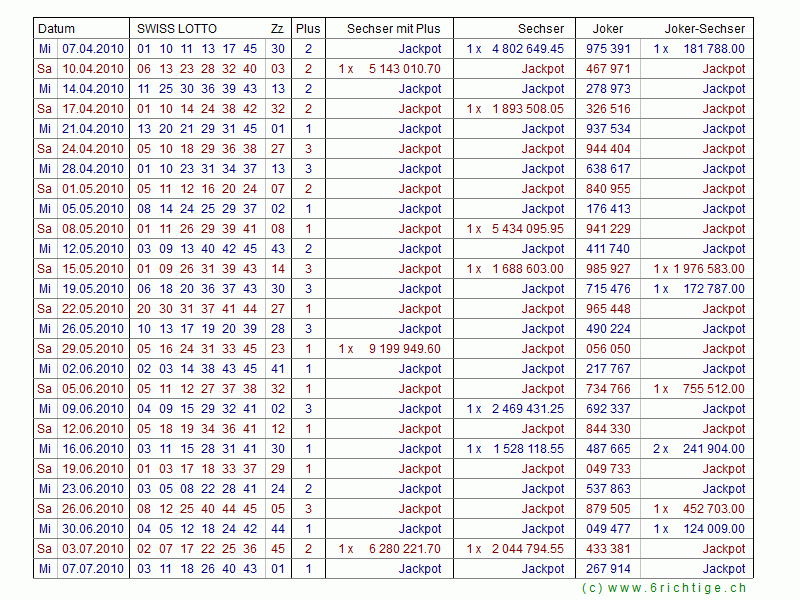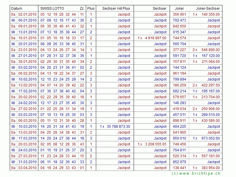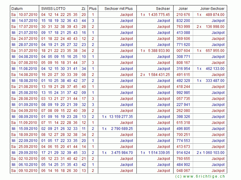 Zahlen- und Quotenarchiv Swiss Lotto und Joker 1970 bis heute