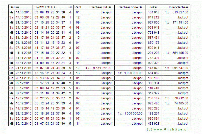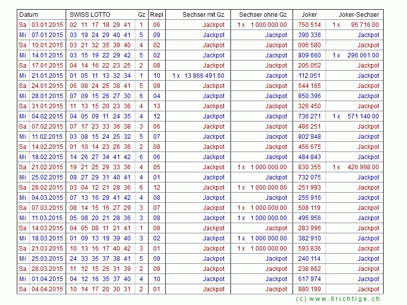 Zahlen- und Quotenarchiv Swiss Lotto und Joker 1970 bis heute