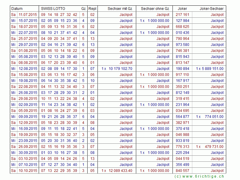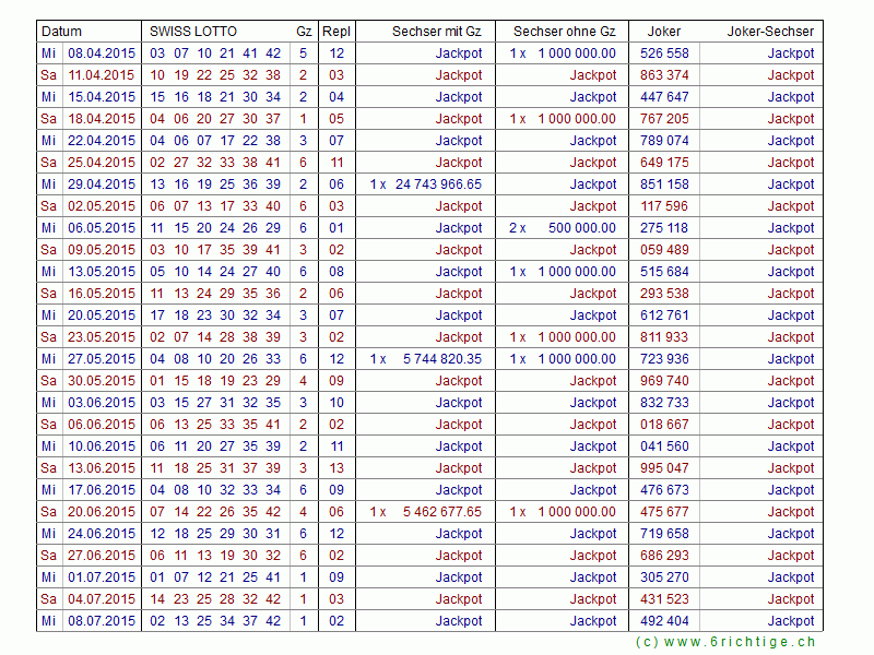 Das Swiss Lotto Zahlenarchiv von 1970 bis heute mit allen Gewinnzahlen und den Quoten für die Lotto- und Jokersechser.