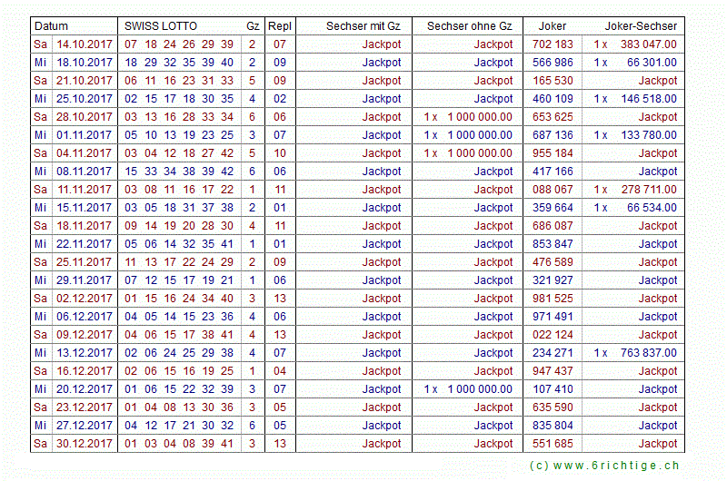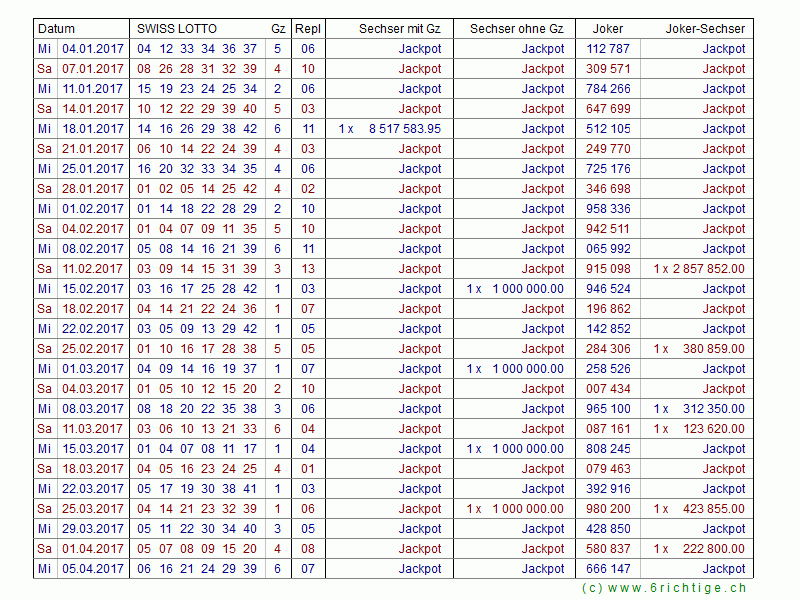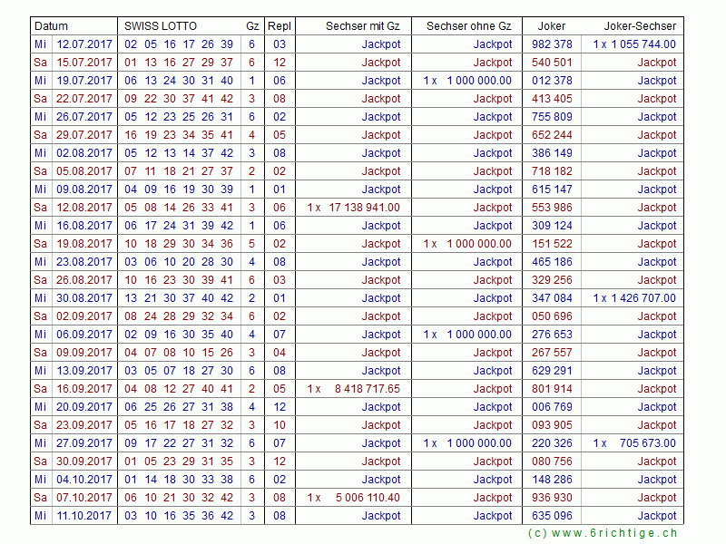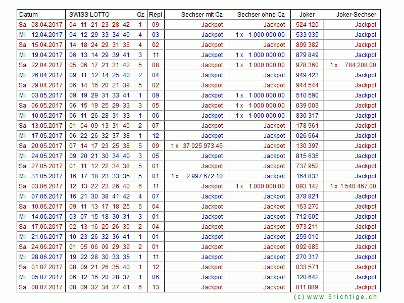 Das Swiss Lotto Zahlenarchiv von 1970 bis heute mit allen Gewinnzahlen und den Quoten für die Lotto- und Jokersechser.