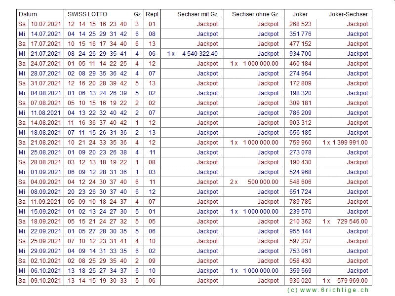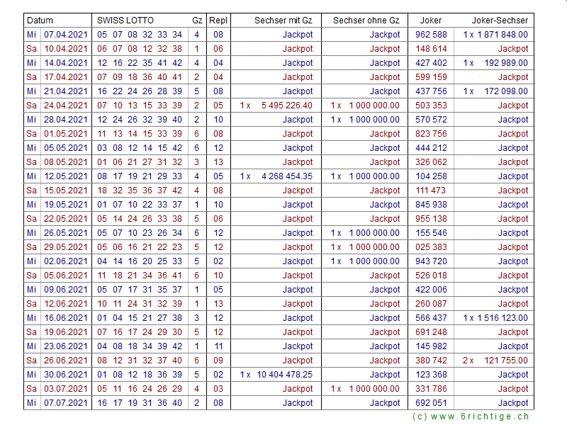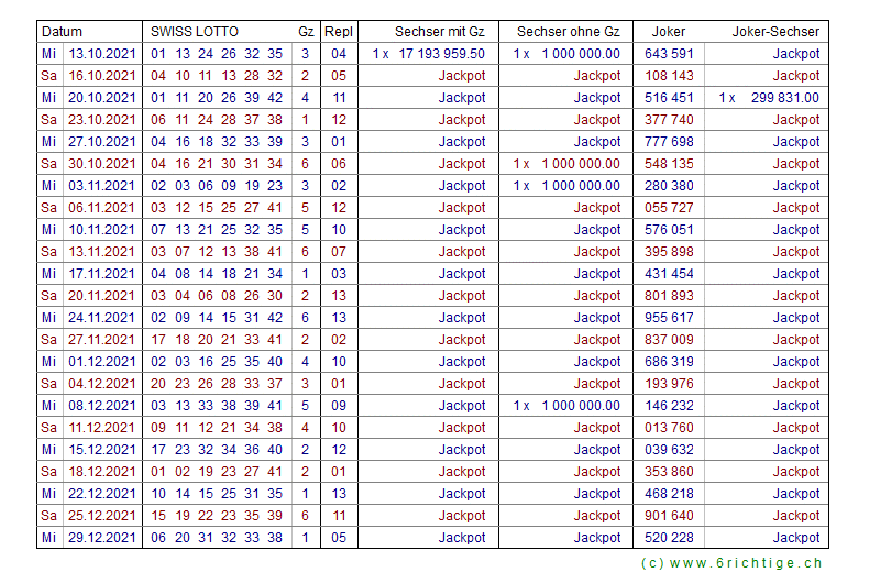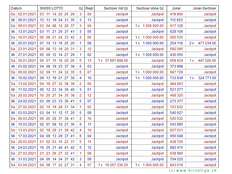 Zahlenarchiv 2021 - Swiss Lotto und Joker